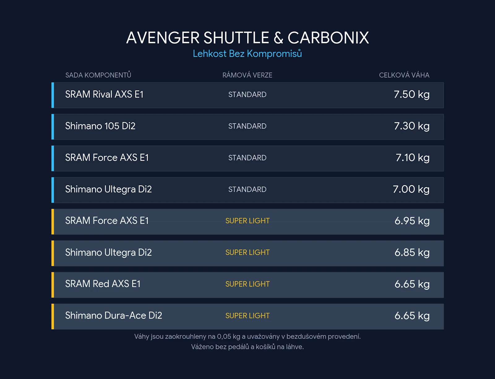 - Avenger Shuttle Standard: Ideální balanc mezi tuhostí, odolností a hmotností. Skvělý základ pro výkonnostní cyklistiku s váhou začínající na 7,00 kg.